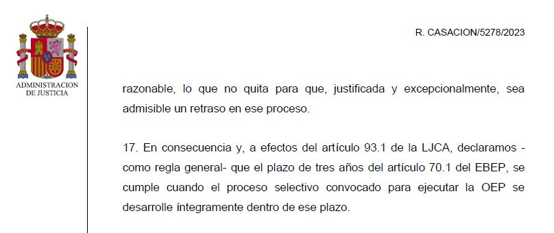 Esta cita no es casual, porque engarza con el hecho de que ya la sala 3ª en sentencia de 1 de octubre de 2024 (rec. 811/2023), concluyó que la disposición adicional 6ª del Real Decreto 625/2023, de 11 de julio, que aprobó la oferta de empleo público de 2023, era ajustada a Derecho, pues preveía que todos los procesos selectivos debían estar finalizados antes de que transcurrieran 2 años, ampliables a 3 por causa justificada, computados desde la aprobación de dicho Real Decreto, y ello porque el artículo 70.1 del TREBEP establece que la ejecución de la oferta de empleo público o instrumento similar deberá desarrollarse «dentro del plazo improrrogable de tres años».